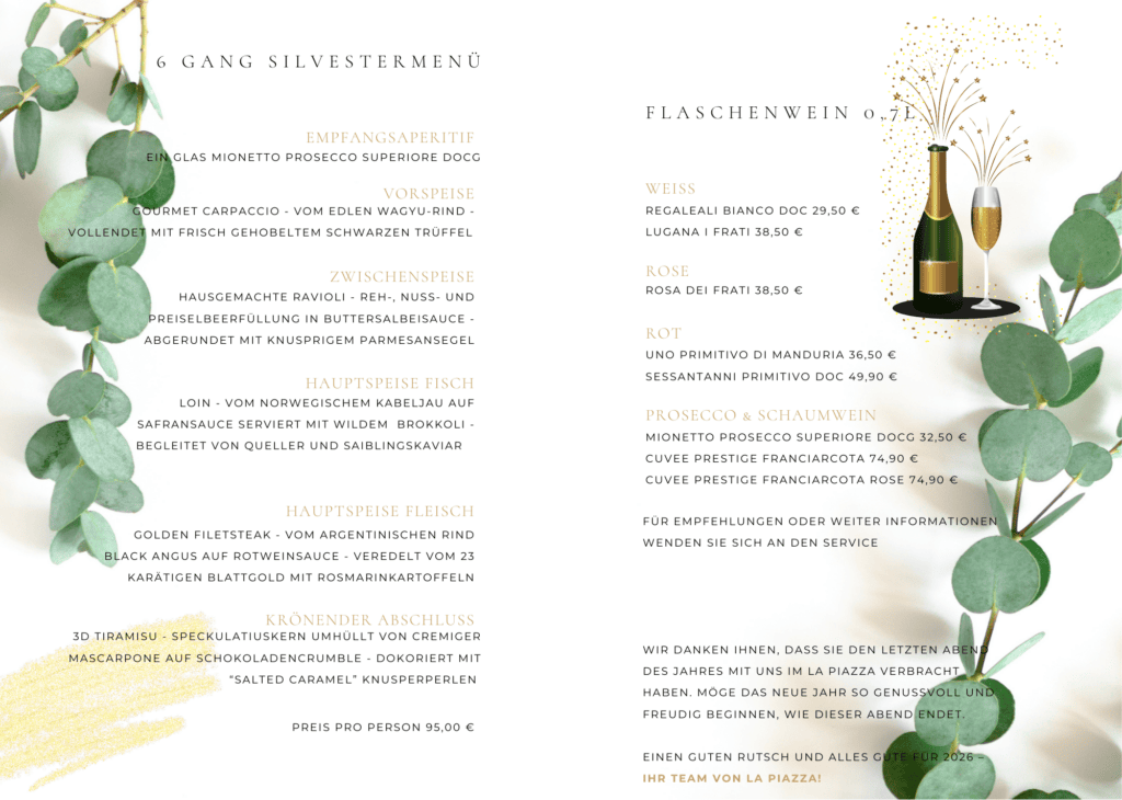 Wir danken Ihnen, dass Sie den letzten Abend des Jahres mit uns im La Piazza verbringen.
