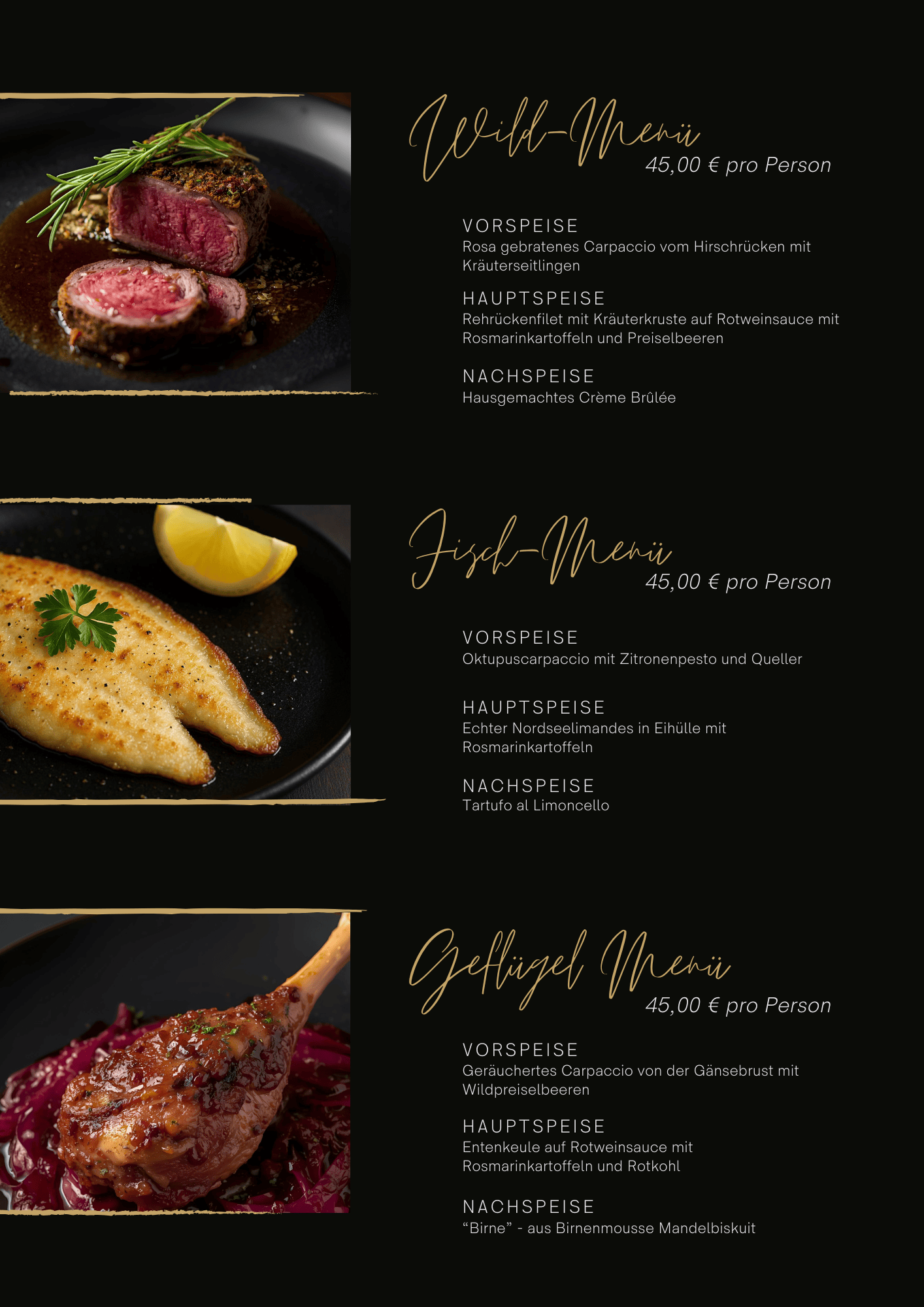 Zartes Wild, aromatische Kräuterkrusten, samtige Rotweinsaucen, duftende Zitronennoten, feiner Fisch, cremige Desserts, winterliche Beeren, geröstete Mandeln, karamellisierte Früchte, mediterrane Kräuter, knusprige Kartoffeln, hausgemachte Spezialitäten, italienische Leidenschaft.